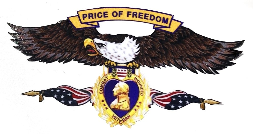 The design clearly shows the 2 symbols as to why we go in to combat for Freedom. The ever vigilant Bald Eagle, the symbol of our country, and the American Flags that drape each side of the Purple Heart. The PH medallion is an exact duplicate of my Purple Heart Challenge Coin. So you can see why I chose the words in the tab, "PRICE OF FREEDOM". It is the price many paid in the Defense Of Freedom.