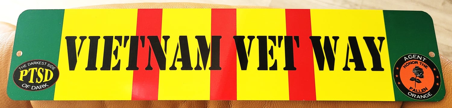 Great for outside or on a wall in your man cave to show everyone that you are a Vietnam Veteran. I've added a small PTSD design and an Agent Orange design on each side to remind all that they play such a significant roll in the Vietnam saga. This sign is "All American" from the aluminum, ink, film, and to the actual manufacture. It is 18" wide and 6: high and is extremely suitable for outdoor use. A hole at each end makes for easy mounting.